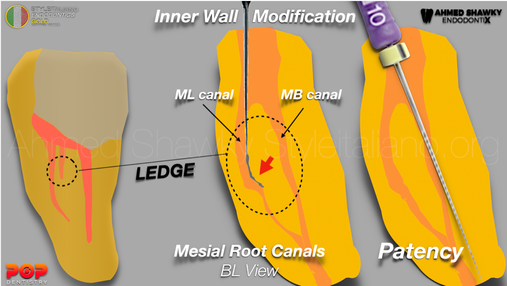 To Manage the ledge in the ML canal, Inner Wall modification was performed using a thin and pre-curved ultrasonic tip, operated at low power, under high magnification… to remove debris, EDTA 17% was used every 10-15 seconds to improve visibility under the dental operating microscope.