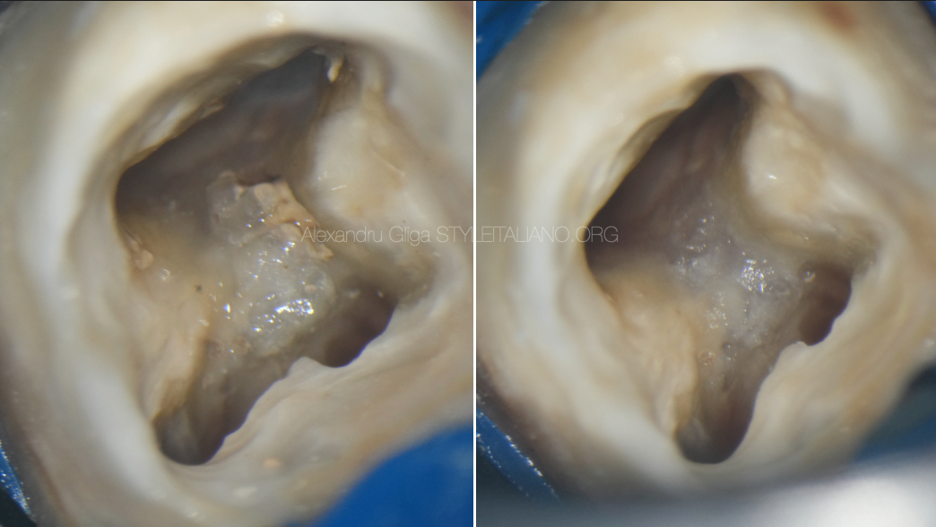 The access cavity was driven by removing the prosthetic crown along with the coronal filling material and the infected dentine.